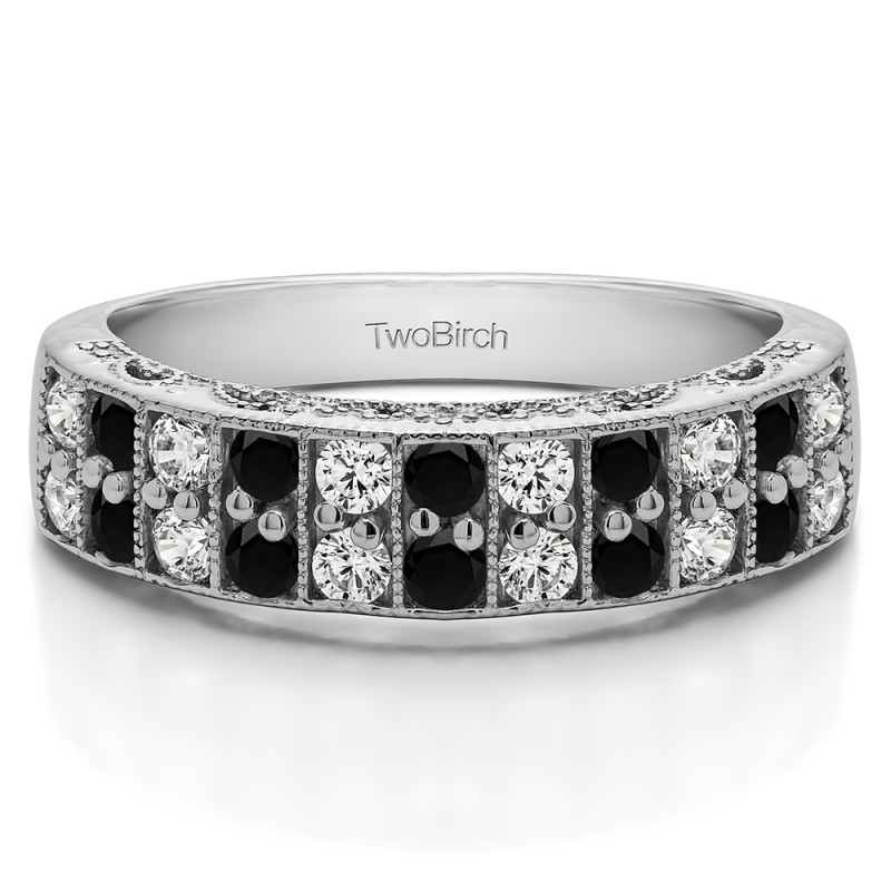 This wedding ring features 22 round channel set stones with a 2 millimeter wide band. The total combined carat weight of the ring is 0.99 carats. It has a double row of round stones with millgrained edges and filigree designs. This wedding ring weighs approximately 5.43 grams.