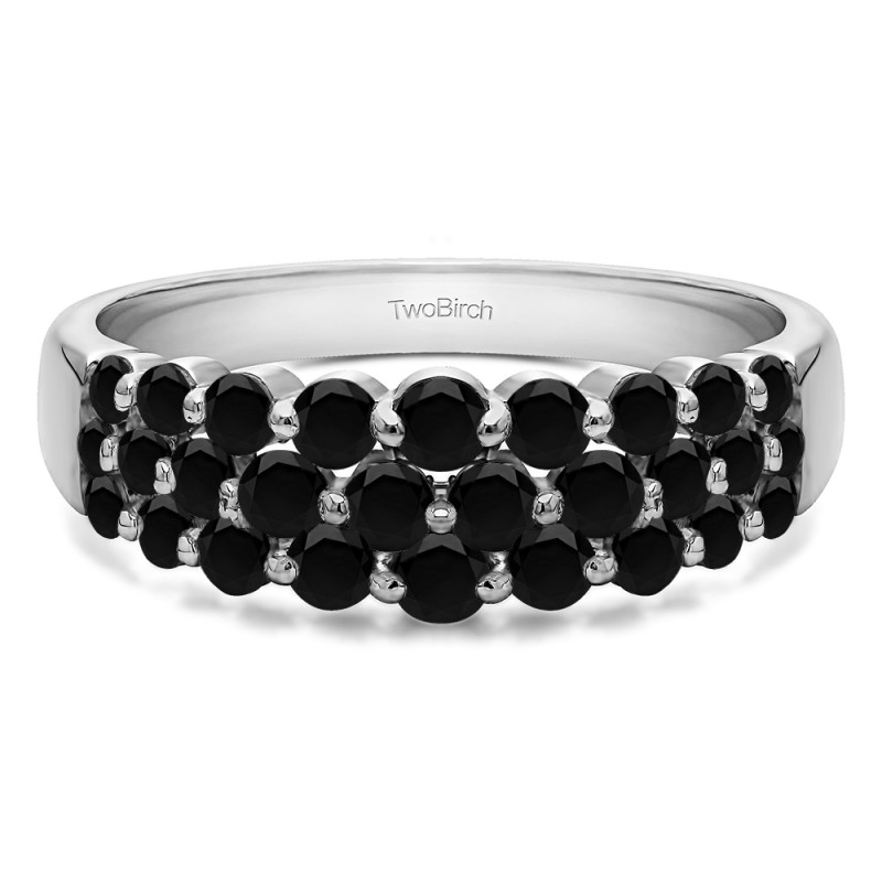 This wedding ring features 28 round prong set stones with a 2 millimeter wide band. The total combined carat weight of the ring is 0.99 carats. It has three rows of common prong set round stones. This wedding ring weighs approximately 4.61 grams.