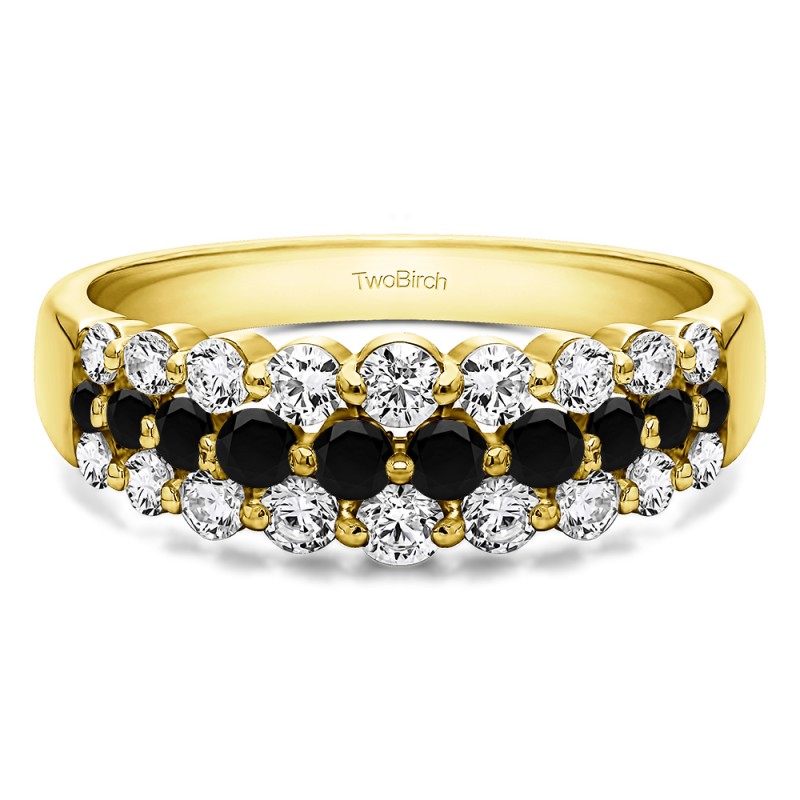 This wedding ring features 28 round prong set stones with a 2 millimeter wide band. The total combined carat weight of the ring is 0.99 carats. It has three rows of common prong set round stones. This wedding ring weighs approximately 4.61 grams.