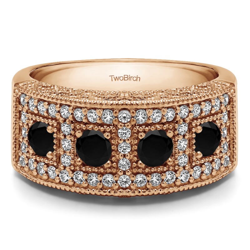 This wedding ring features 53 round prong set stones with a 2 millimeter wide band. The total combined carat weight of the ring is 1.01 carats. It has four larger stones with smaller stones surrounding them. It also features millgrained edges and filigree design. This wedding ring weighs approximately 10.76 grams.