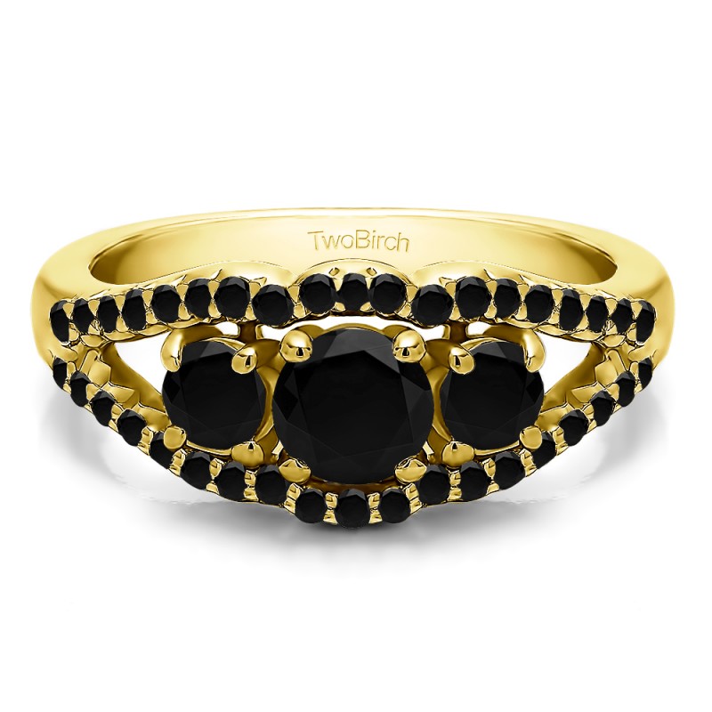 This wedding ring features 41 round prong set stones with a 2 millimeter wide band. The total combined carat weight of the ring is 1.04 carats. It has a traditional three stone design with a beautiful halo. This wedding ring weighs approximately 6.41 grams.
