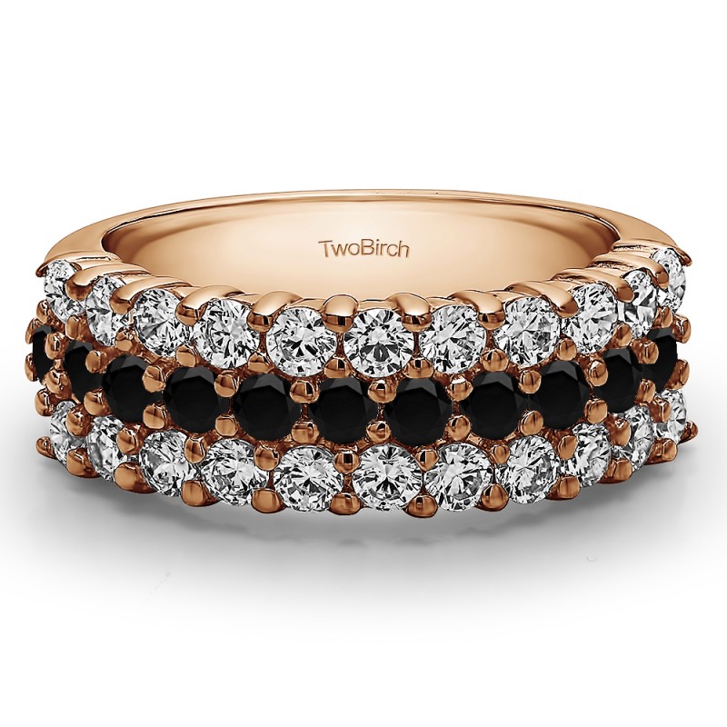 This wedding ring features 33 round prong set stones with a 2 millimeter wide band. The total combined carat weight of the ring is 1.49 carats. It has three rows of shared prong set round stones. This wedding ring weighs approximately 7.58 grams.