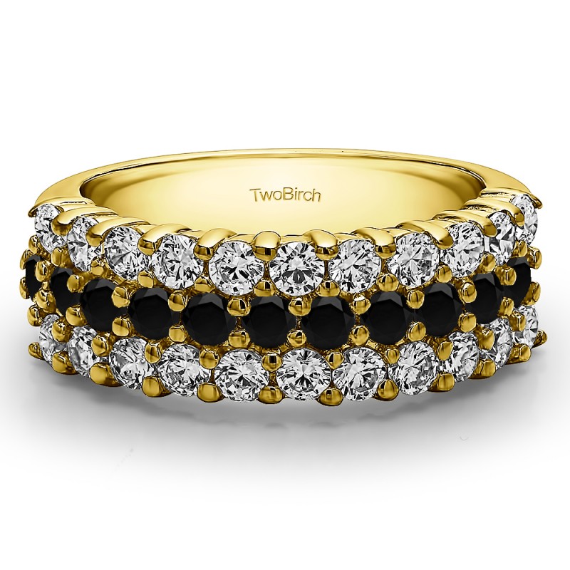 This wedding ring features 33 round prong set stones with a 2 millimeter wide band. The total combined carat weight of the ring is 1.49 carats. It has three rows of shared prong set round stones. This wedding ring weighs approximately 7.58 grams.