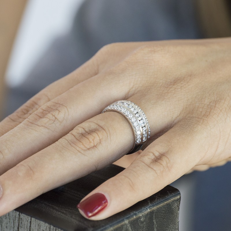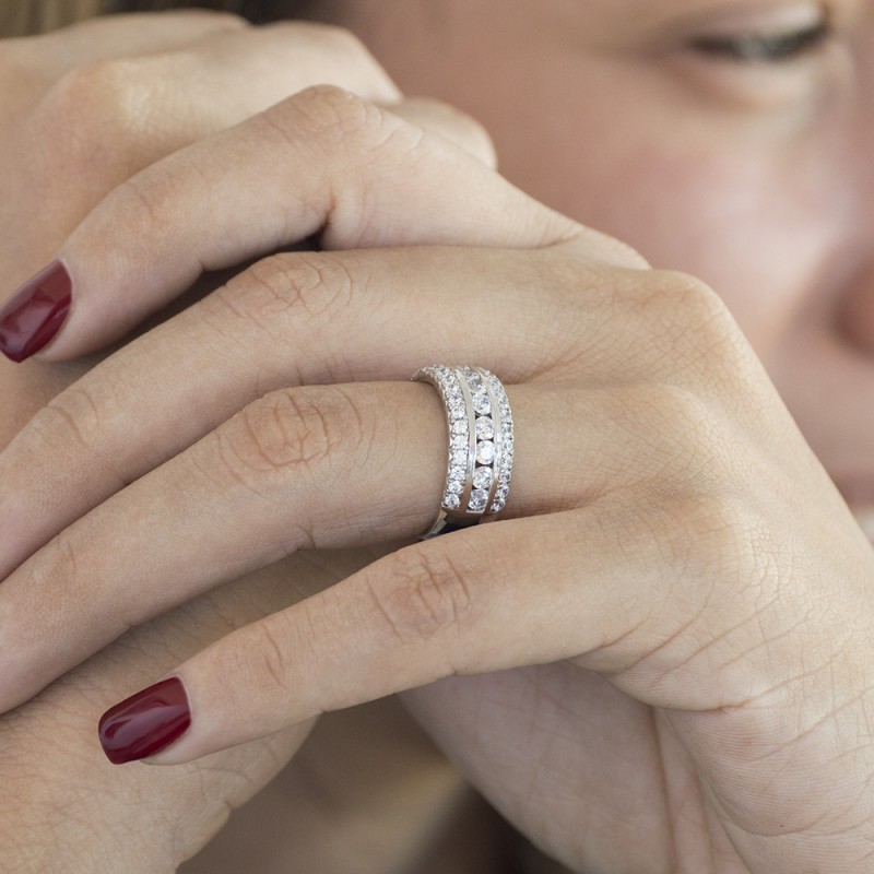 This wedding ring features 42 round prong set stones with a 2 millimeter wide band. The total combined carat weight of the ring is 1.52 carats. It features three rows of stones. This wedding ring weighs approximately 11.26 grams.