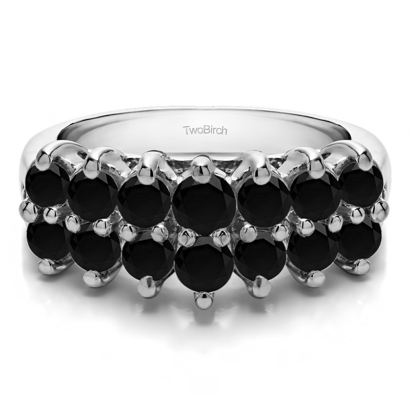 This wedding ring features 14 round prong set stones with a 2 millimeter wide band. The total combined carat weight of the ring is 1.96 carats. Two rows of double shared prongs making this anniversary band both durable and stunning. This wedding ring weighs approximately 6.2 grams.