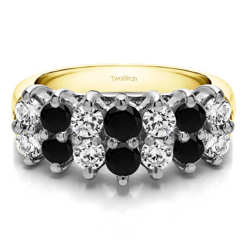 This wedding ring features 14 round prong set stones with a 2 millimeter wide band. The total combined carat weight of the ring is 1.96 carats. Two rows of double shared prongs making this anniversary band both durable and stunning. This wedding ring weighs approximately 6.2 grams.