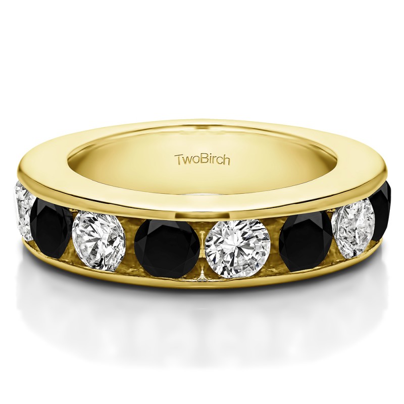 This wedding ring features 10 round channel set stones with a 2 millimeter wide band. The total combined carat weight of the ring is 1 carats. It has a channel set design with millgrained edges. This wedding ring weighs approximately 5.32 grams.