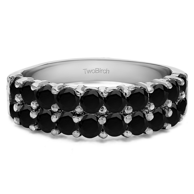 This wedding ring features 20 round prong set stones with a 2 millimeter wide band. The total combined carat weight of the ring is 1 carats. This ring has a double row of shared prong stones. This wedding ring weighs approximately 4.79 grams.