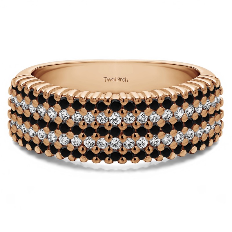 This wedding ring features 100 round prong set stones with a 2 millimeter wide band. The total combined carat weight of the ring is 1 carats. It has three rows of shared prong stones. This wedding ring weighs approximately 7.35 grams.