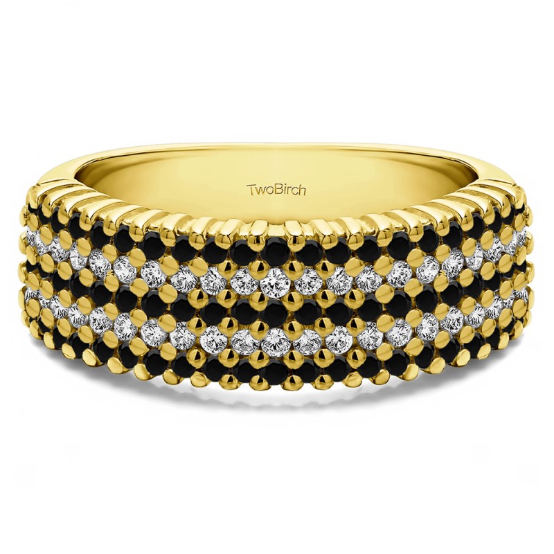 This wedding ring features 100 round prong set stones with a 2 millimeter wide band. The total combined carat weight of the ring is 1 carats. It has three rows of shared prong stones. This wedding ring weighs approximately 7.35 grams.