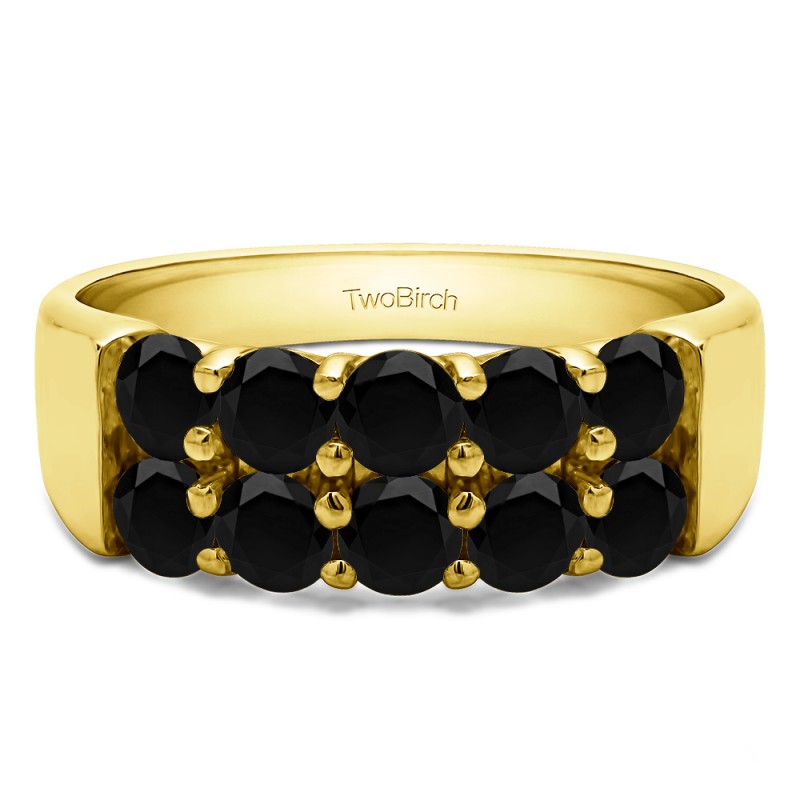 This wedding ring features 10 round prong set stones with a 2 millimeter wide band. The total combined carat weight of the ring is 1 carats. This ring has a double row of shared prong stones. This wedding ring weighs approximately 6.55 grams.