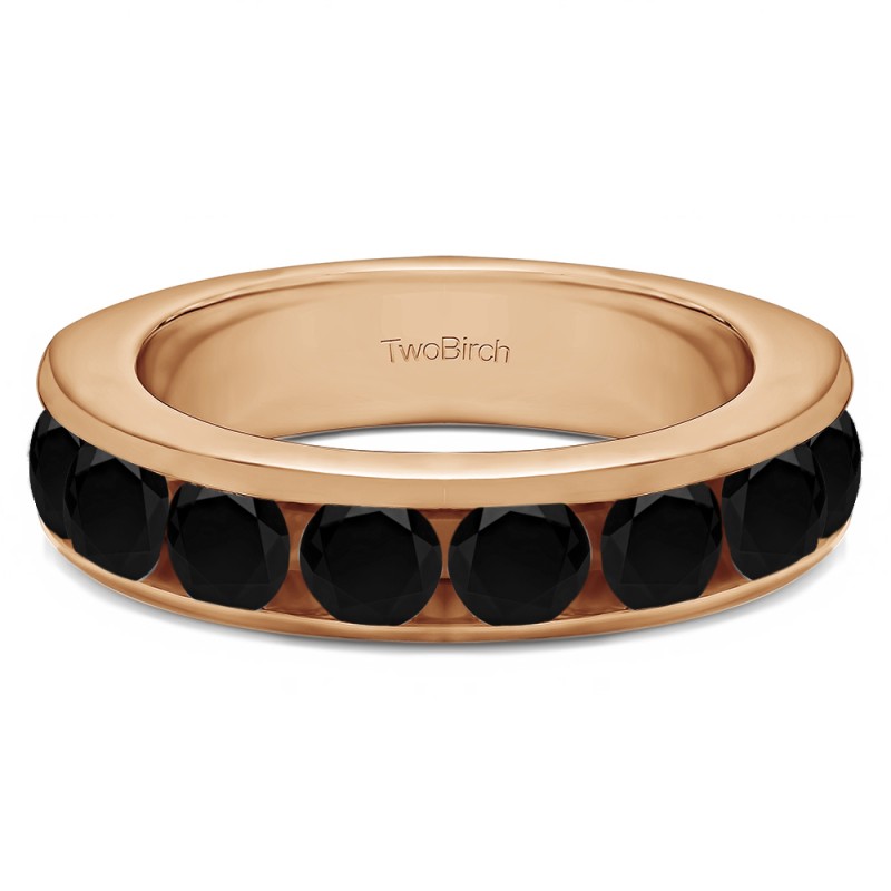 This wedding ring features 8 round channel set stones with a 2 millimeter wide band. The total combined carat weight of the ring is 2 carats. It has a high polish finish. This wedding ring weighs approximately 8.62 grams.