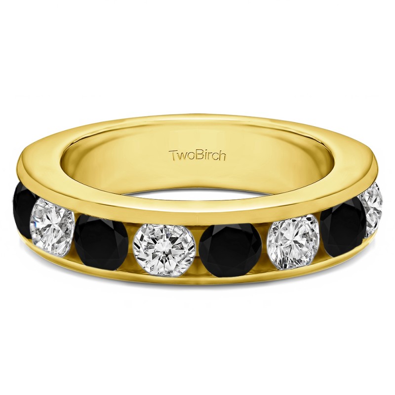 This wedding ring features 8 round channel set stones with a 2 millimeter wide band. The total combined carat weight of the ring is 2 carats. It has a high polish finish. This wedding ring weighs approximately 8.62 grams.