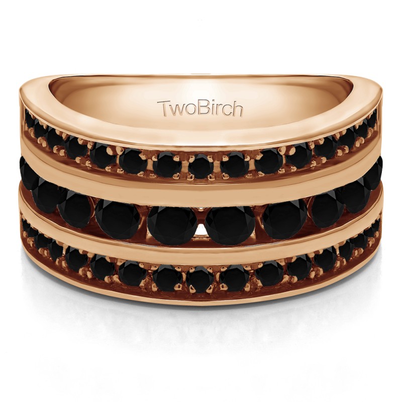 This wedding ring features 40 round channel set stones with a 2 millimeter wide band. The total combined carat weight of the ring is 2 carats. This band is very wide and features three rows of channel set stones. This wedding ring weighs approximately 14.69 grams.