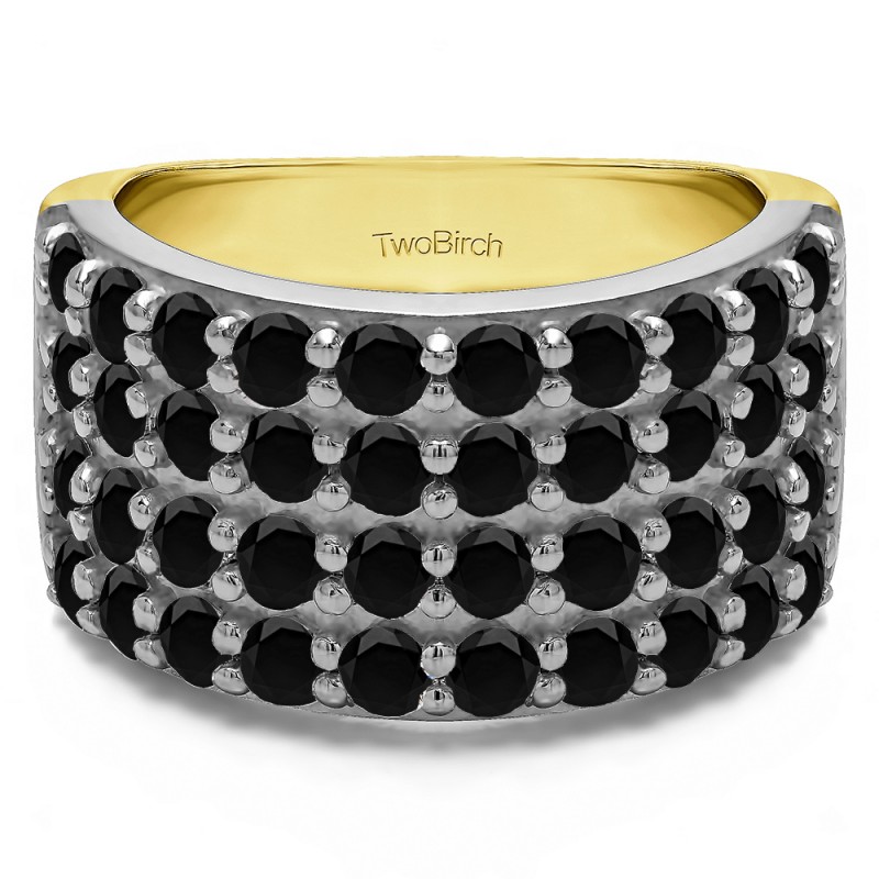 This wedding ring features 40 round prong set stones with a 2 millimeter wide band. The total combined carat weight of the ring is 2 carats. It features four rows of round shared prong set stones. This wedding ring weighs approximately 17.49 grams.