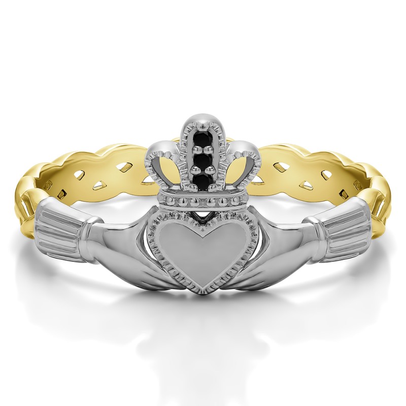 This wedding ring features 3 round prong set stones with a 2 millimeter wide band. The total combined carat weight of the ring is 0.02 carats. It features a Celtic Claddagh design with a pave set crown detailing. This wedding ring weighs approximately 3.82 grams.