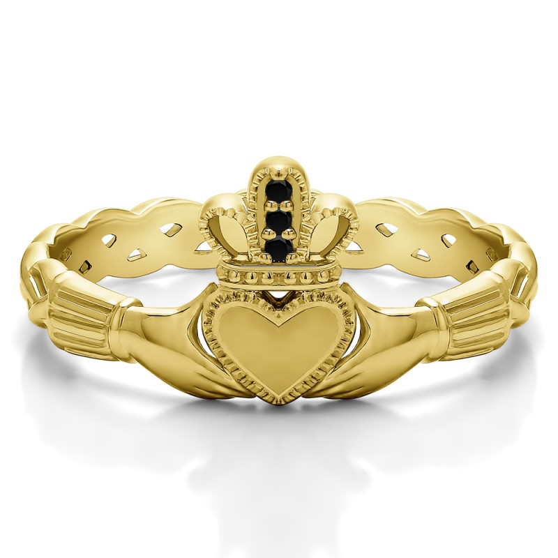 This wedding ring features 3 round prong set stones with a 2 millimeter wide band. The total combined carat weight of the ring is 0.02 carats. It features a Celtic Claddagh design with a pave set crown detailing. This wedding ring weighs approximately 3.82 grams.