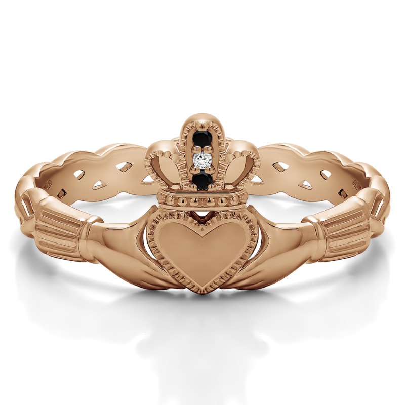 This wedding ring features 3 round prong set stones with a 2 millimeter wide band. The total combined carat weight of the ring is 0.02 carats. It features a Celtic Claddagh design with a pave set crown detailing. This wedding ring weighs approximately 3.82 grams.