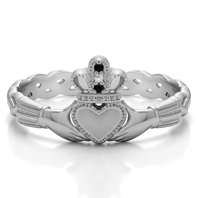This wedding ring features 3 round prong set stones with a 2 millimeter wide band. The total combined carat weight of the ring is 0.02 carats. It features a Celtic Claddagh design with a pave set crown detailing. This wedding ring weighs approximately 3.82 grams.