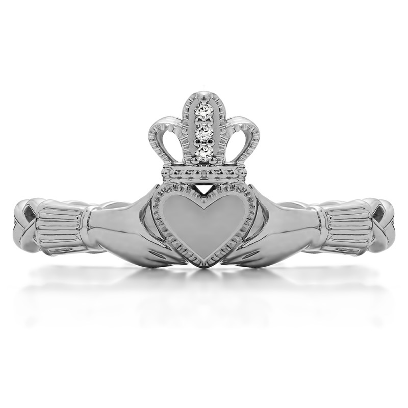 This wedding ring features 3 round prong set stones with a 2 millimeter wide band. The total combined carat weight of the ring is 0.02 carats. It features a Celtic Claddagh design with a pave set crown detailing. This wedding ring weighs approximately 3.82 grams.