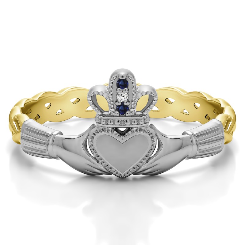 This wedding ring features 3 round prong set stones with a 2 millimeter wide band. The total combined carat weight of the ring is 0.02 carats. It features a Celtic Claddagh design with a pave set crown detailing. This wedding ring weighs approximately 3.82 grams.