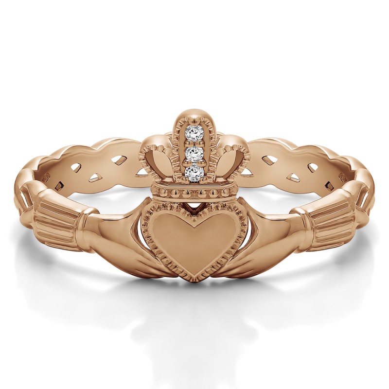 This wedding ring features 3 round prong set stones with a 2 millimeter wide band. The total combined carat weight of the ring is 0.02 carats. It features a Celtic Claddagh design with a pave set crown detailing. This wedding ring weighs approximately 3.82 grams.