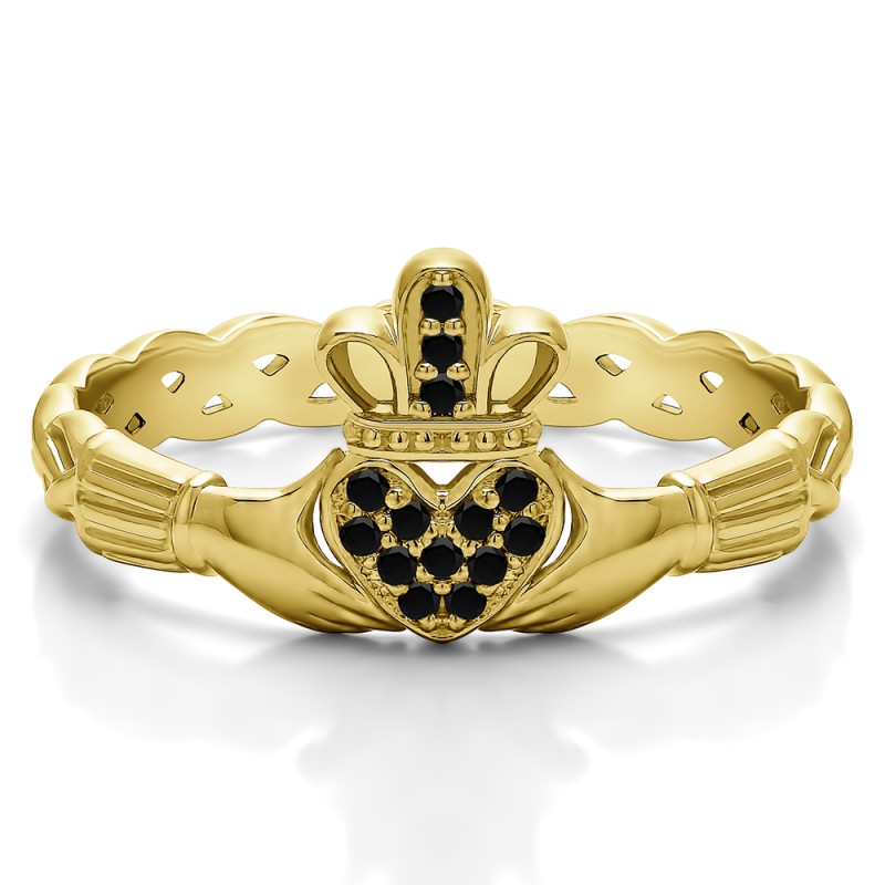 This wedding ring features 14 round prong set stones with a 2 millimeter wide band. The total combined carat weight of the ring is 0.07 carats. It features a Celtic Claddagh design with a pave set heart in the center. This wedding ring weighs approximately 3.52 grams.
