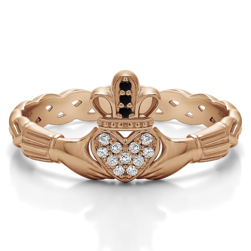 This wedding ring features 14 round prong set stones with a 2 millimeter wide band. The total combined carat weight of the ring is 0.07 carats. It features a Celtic Claddagh design with a pave set heart in the center. This wedding ring weighs approximately 3.52 grams.