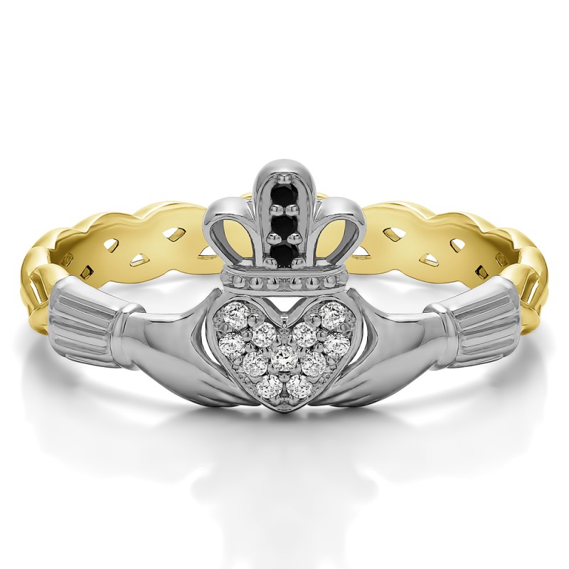 This wedding ring features 14 round prong set stones with a 2 millimeter wide band. The total combined carat weight of the ring is 0.07 carats. It features a Celtic Claddagh design with a pave set heart in the center. This wedding ring weighs approximately 3.52 grams.