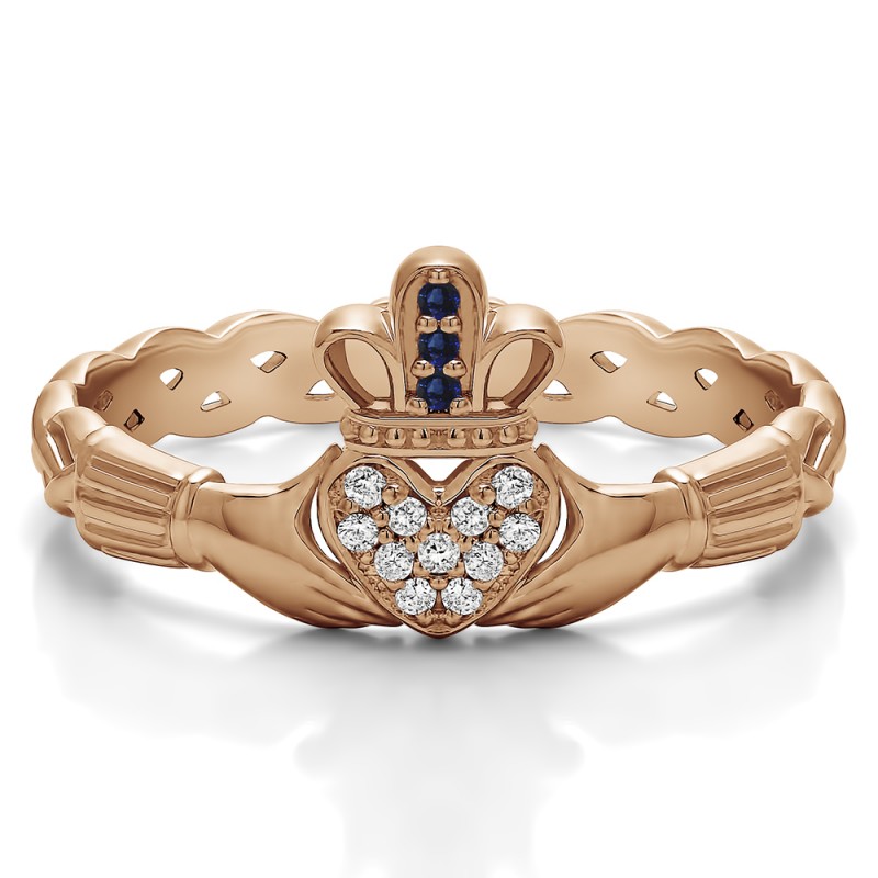 This wedding ring features 14 round prong set stones with a 2 millimeter wide band. The total combined carat weight of the ring is 0.07 carats. It features a Celtic Claddagh design with a pave set heart in the center. This wedding ring weighs approximately 3.52 grams.