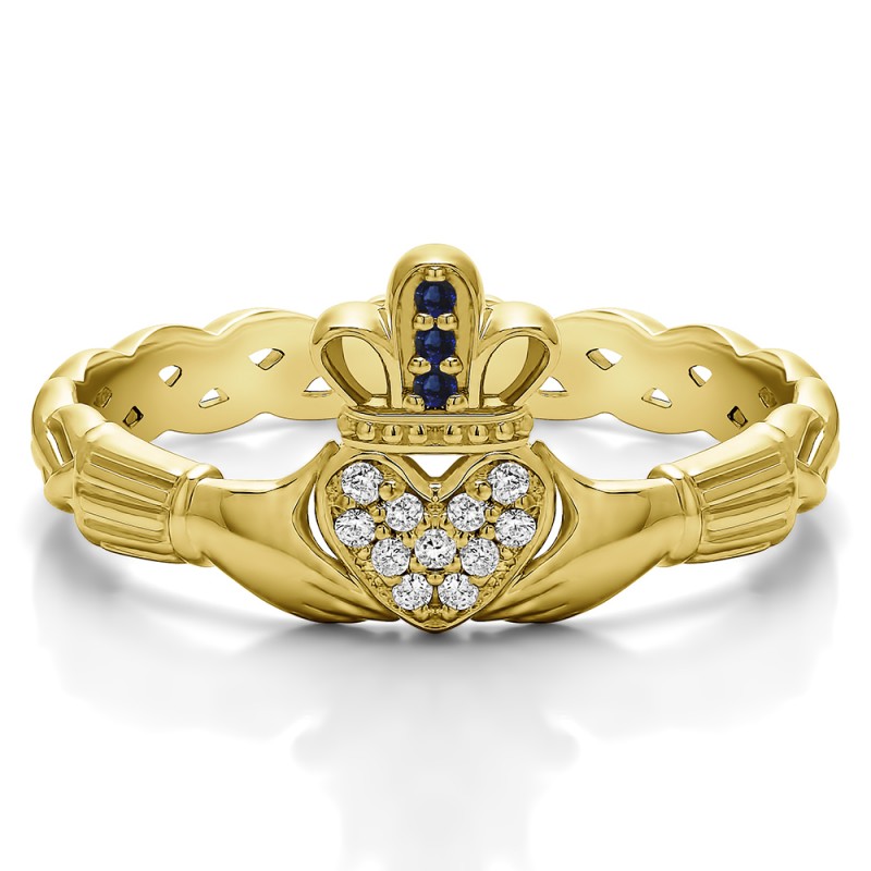 This wedding ring features 14 round prong set stones with a 2 millimeter wide band. The total combined carat weight of the ring is 0.07 carats. It features a Celtic Claddagh design with a pave set heart in the center. This wedding ring weighs approximately 3.52 grams.