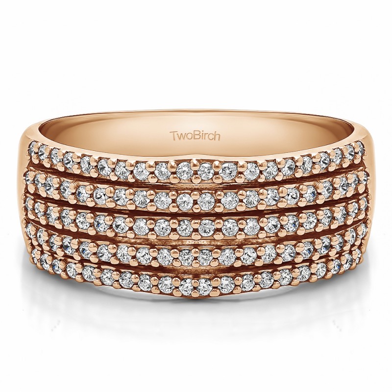 This wedding ring features 100 round prong set stones with a 2 millimeter wide band. The total combined carat weight of the ring is 0.5 carats. It has multiple rows of shred prong set round stones. This wedding ring weighs approximately 8.71 grams.