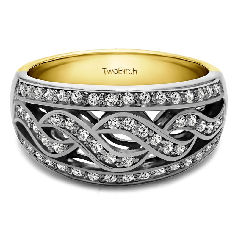 This wedding ring features 54 round prong set stones with a 2 millimeter wide band. The total combined carat weight of the ring is 0.54 carats. It features an infinity braid in the center. This wedding ring weighs approximately 9.31 grams.