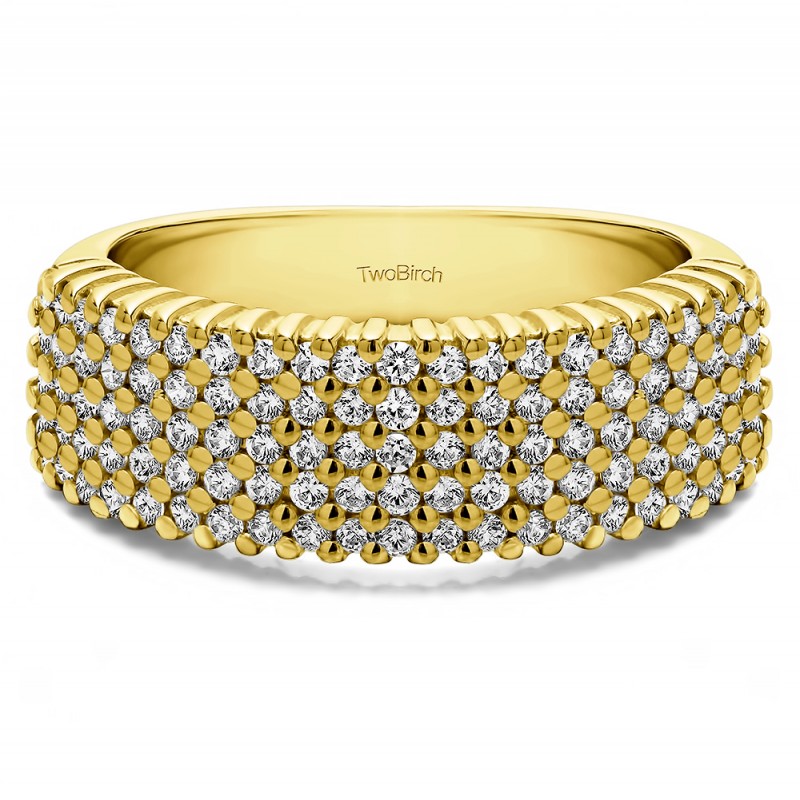 This wedding ring features 100 round prong set stones with a 2 millimeter wide band. The total combined carat weight of the ring is 1 carats. It has three rows of shared prong stones. This wedding ring weighs approximately 7.35 grams.