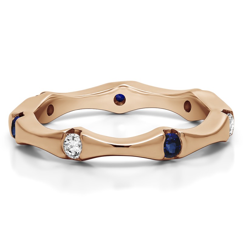 This wedding ring features 7 round bezel set stones with a 2 millimeter wide band. The total combined carat weight of the ring is 0.25 carats. It has stones spaced throughout the entirety of the band. This wedding ring weighs approximately 2.59 grams.