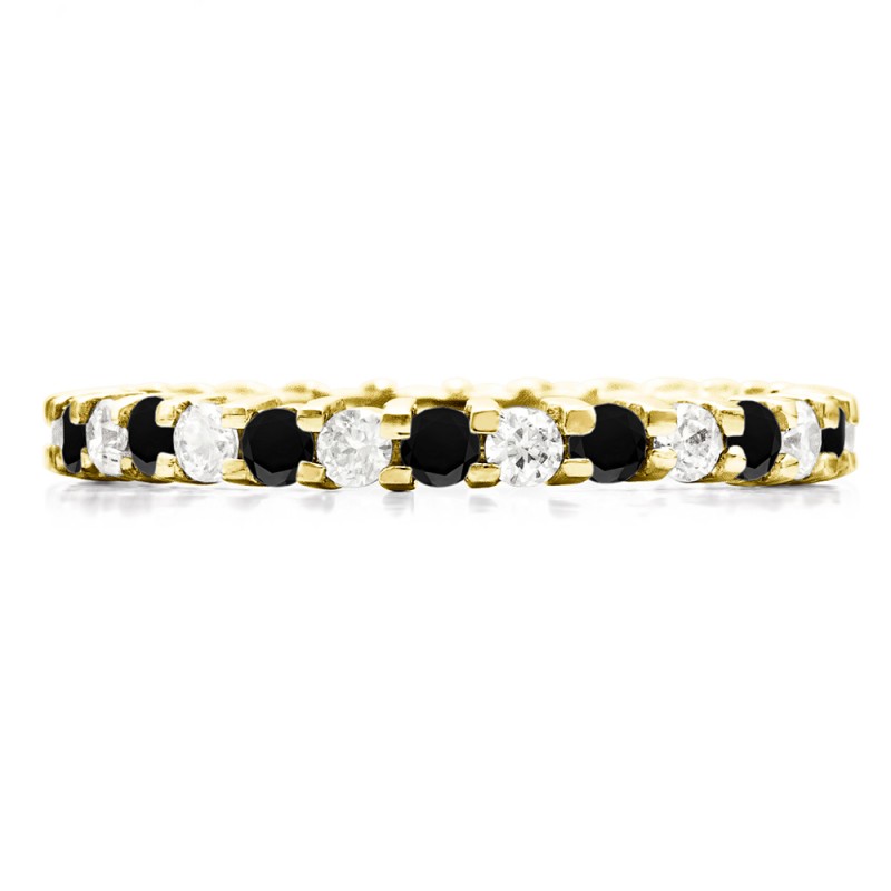 This eternity band is classic and timeless, featuring a continual band of round stones, set with double shared prongs. This makes for the perfect anniversary or wedding band.