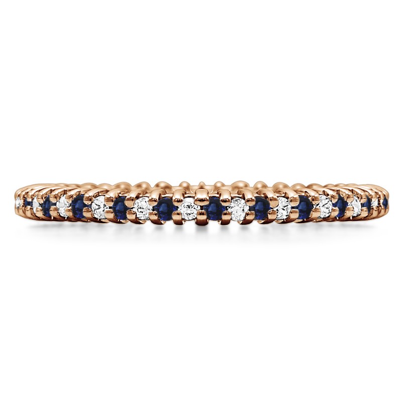 This eternity band is classic and timeless, featuring a continual band of round stones, set with double shared prongs. This makes for the perfect anniversary or wedding band.