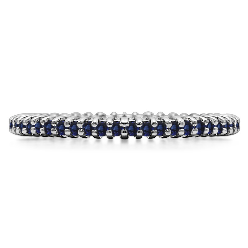 This eternity band is classic and timeless, featuring a continual band of round stones, set with double shared prongs. This makes for the perfect anniversary or wedding band.