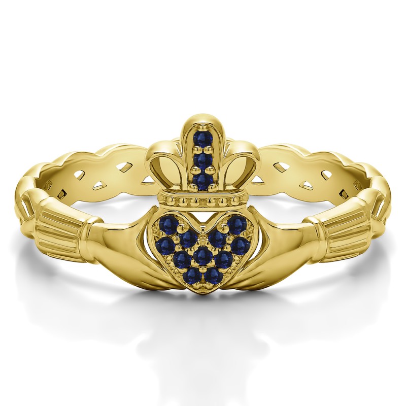 This wedding ring features 14 round prong set stones with a 2 millimeter wide band. The total combined carat weight of the ring is 0.07 carats. It features a Celtic Claddagh design with a pave set heart in the center. This wedding ring weighs approximately 3.52 grams.
