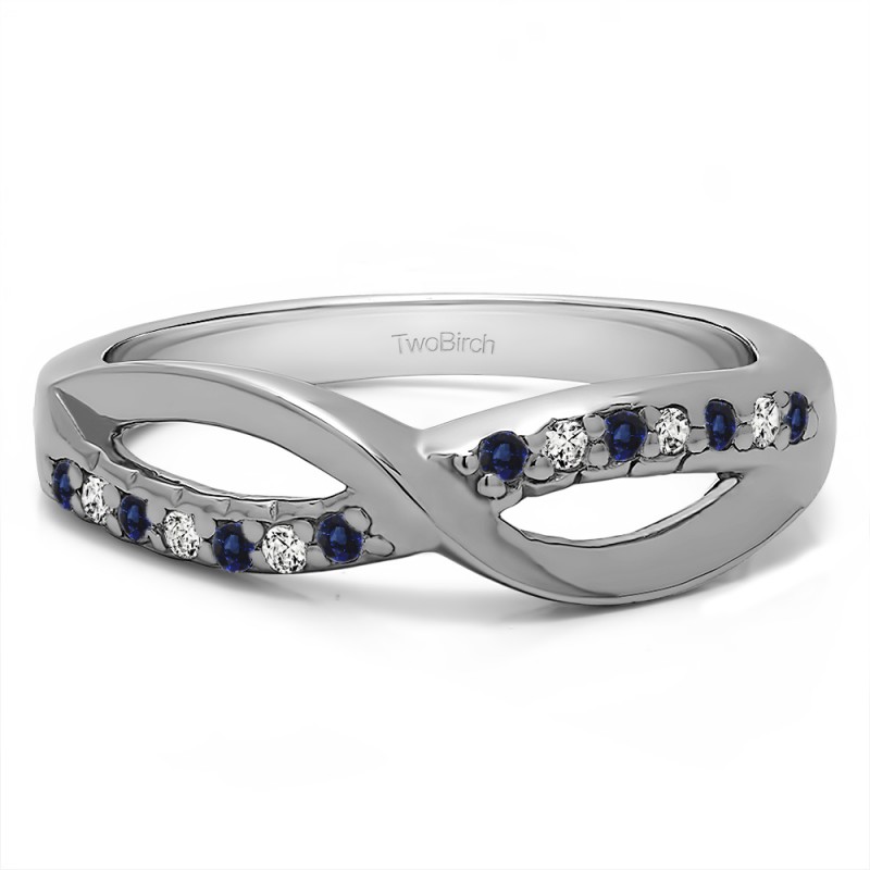 This wedding ring features 14 round prong set stones with a 2 millimeter wide band. The total combined carat weight of the ring is 0.14 carats. It has an infinity cut out design with a high polish finish. This wedding ring weighs approximately 8.22 grams.