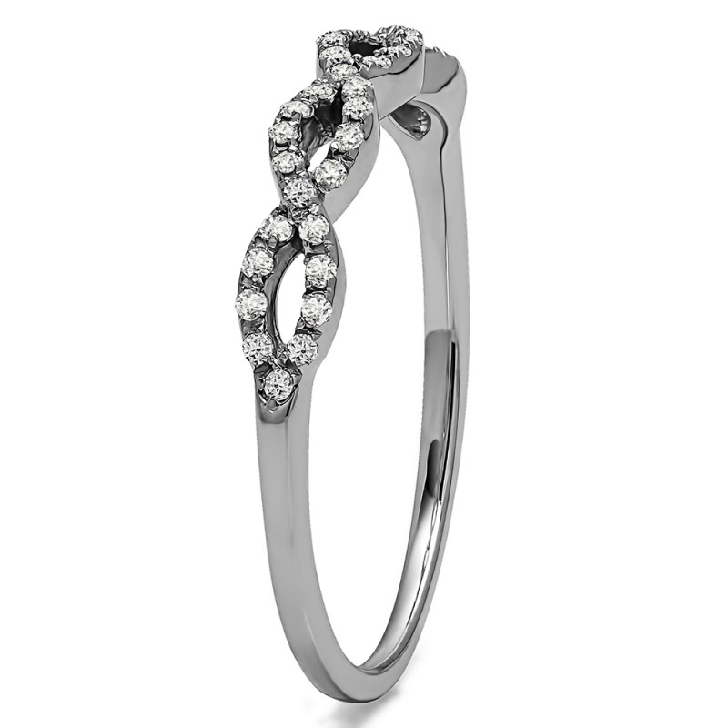 This wedding ring features 37 round prong set stones with a 2 millimeter wide band. The total combined carat weight of the ring is 0.15 carats. It has cut out infinity design. This wedding ring weighs approximately 2.94 grams.