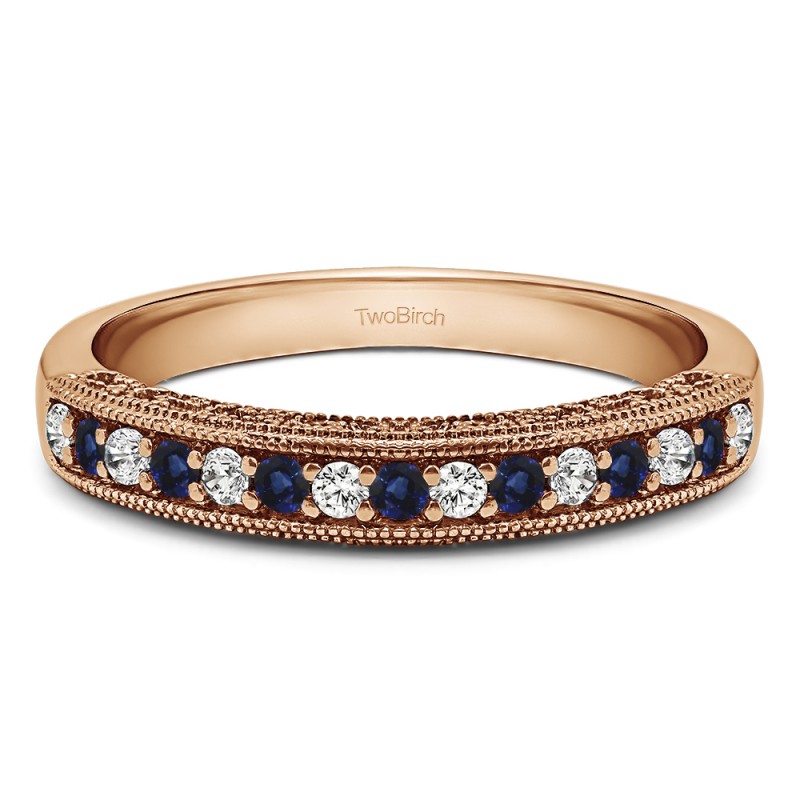 This wedding ring features round pave set stones with a 3 millimeter wide band. The total combined carat weight of the ring is carats. It has filigree designs and millgrained edges. This wedding ring weighs approximately 3.5805 grams.