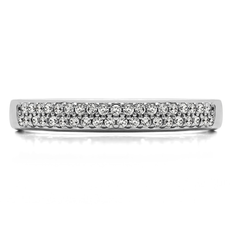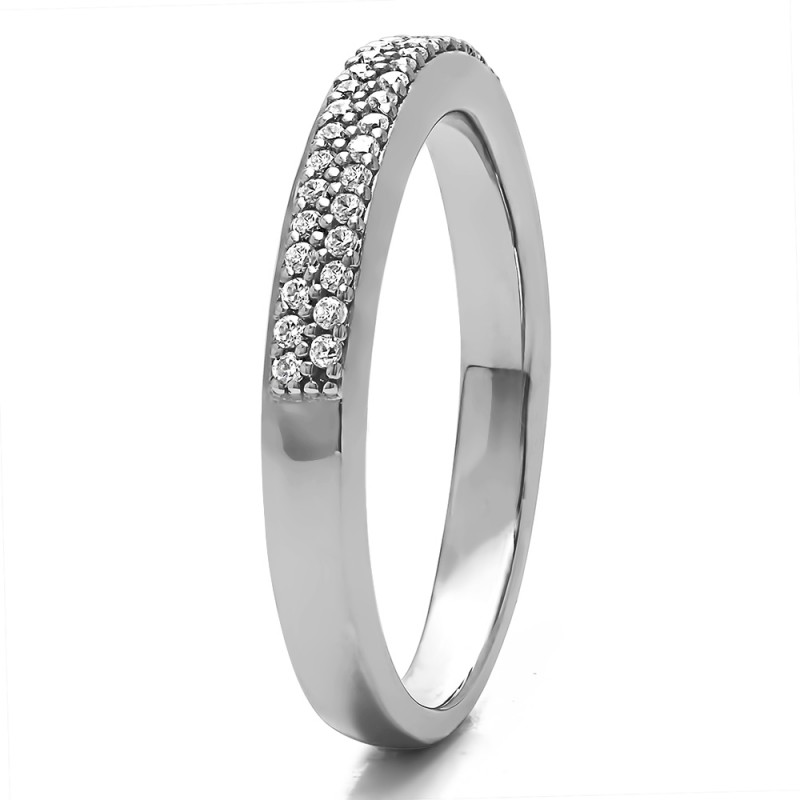 This wedding ring features 40 round prong set stones with a 2 millimeter wide band. The total combined carat weight of the ring is 0.2 carats. It has a double row of round stones set with shared prongs. This wedding ring weighs approximately 5.99 grams.