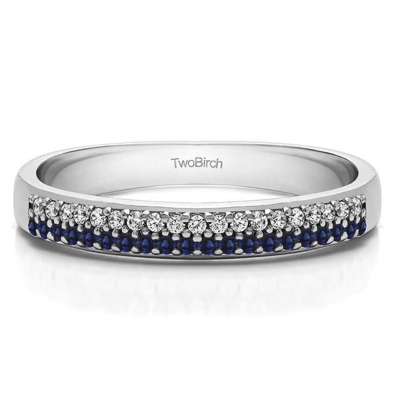 This wedding ring features 40 round prong set stones with a 2 millimeter wide band. The total combined carat weight of the ring is 0.2 carats. It has a double row of round stones set with shared prongs. This wedding ring weighs approximately 5.99 grams.
