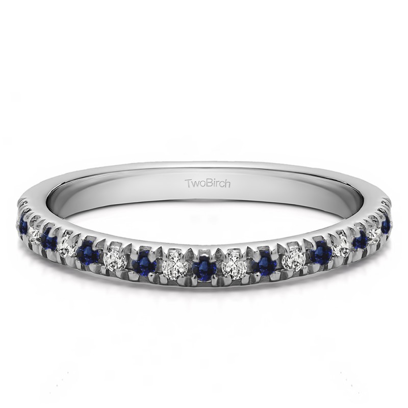 This wedding ring features 20 round prong set stones with a 2 millimeter wide band. The total combined carat weight of the ring is 0.2 carats. It has a unique French cut style setting. This wedding ring weighs approximately 3.09 grams.