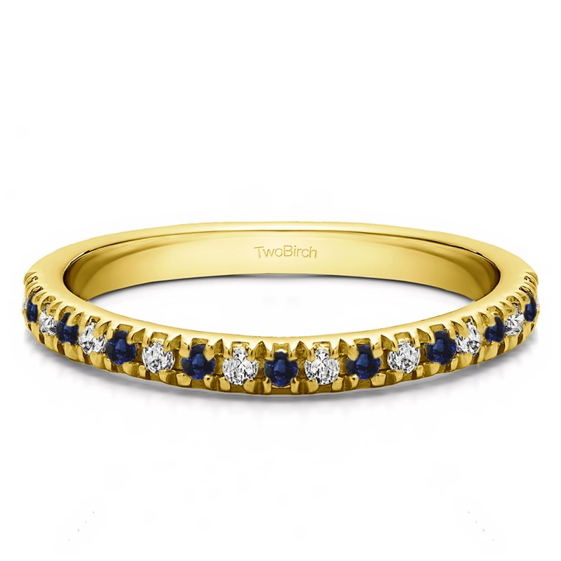 This wedding ring features 20 round prong set stones with a 2 millimeter wide band. The total combined carat weight of the ring is 0.2 carats. It has a unique French cut style setting. This wedding ring weighs approximately 3.09 grams.