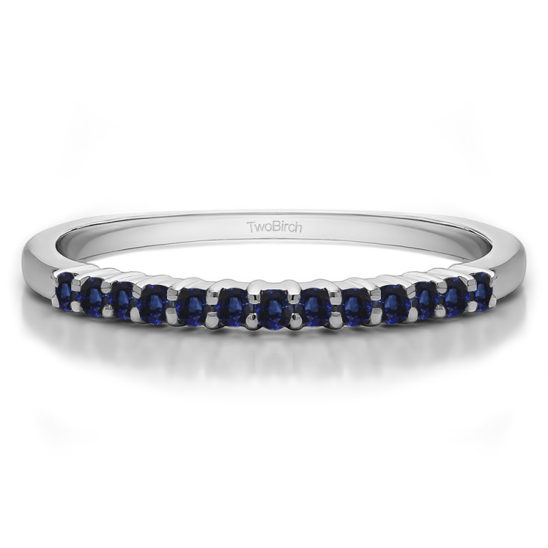 This wedding ring features 13 round prong set stones with a 2 millimeter wide band. The total combined carat weight of the ring is 0.25 carats. It features a double row of shared prong set round stones. This wedding ring weighs approximately 3.17 grams.
