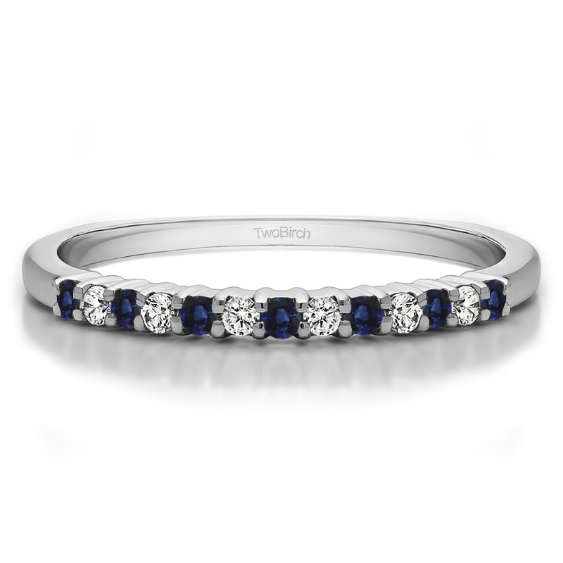 This wedding ring features 13 round prong set stones with a 2 millimeter wide band. The total combined carat weight of the ring is 0.25 carats. It features a double row of shared prong set round stones. This wedding ring weighs approximately 3.17 grams.