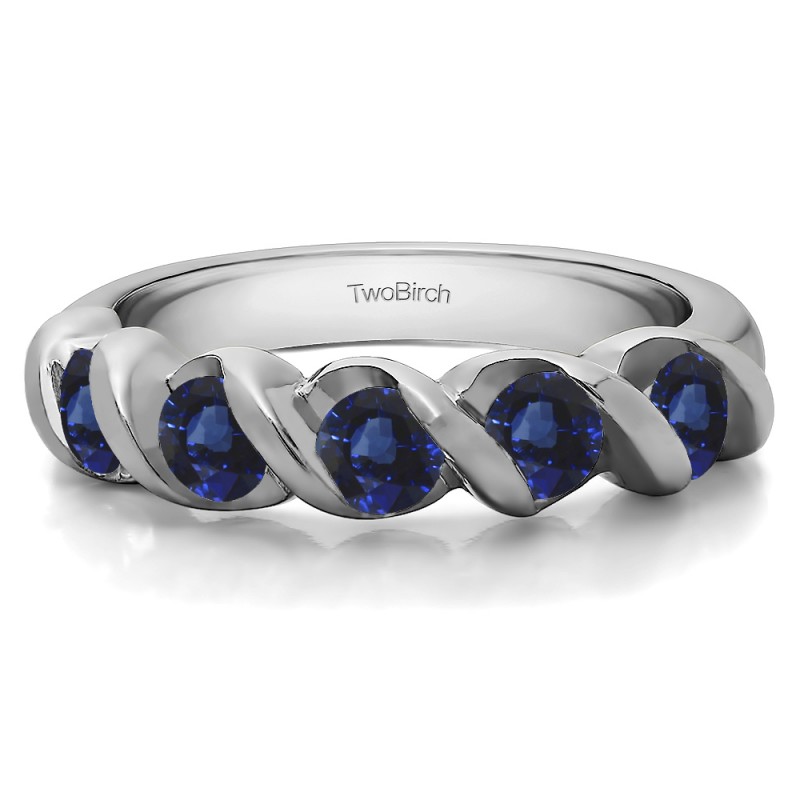 This wedding ring features 5 round bar set stones with a 2 millimeter wide band. The total combined carat weight of the ring is 0.25 carats. Each round stone is separated by a stunning swirl of high polished meal. This wedding ring weighs approximately 3.93 grams.