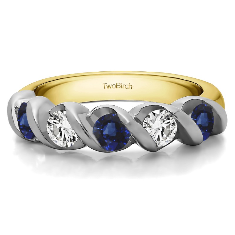 This wedding ring features 5 round bar set stones with a 2 millimeter wide band. The total combined carat weight of the ring is 0.25 carats. Each round stone is separated by a stunning swirl of high polished meal. This wedding ring weighs approximately 3.93 grams.